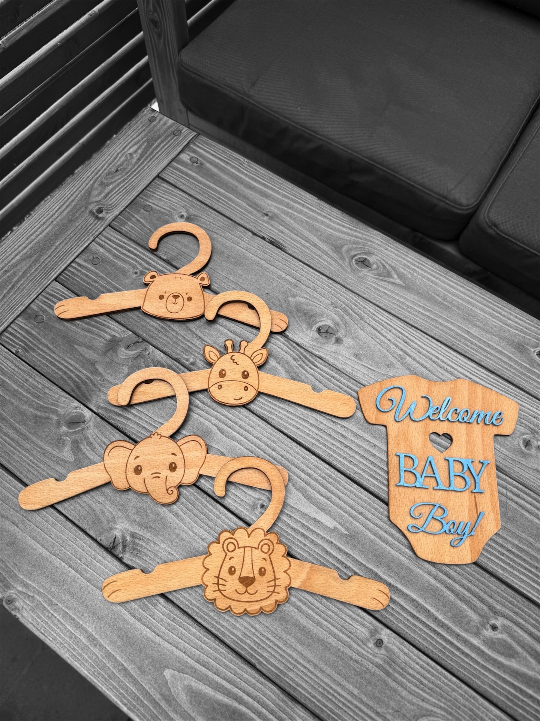 - 4 wooden animal-themed hangers (lion, elephant, giraffe, and bear)