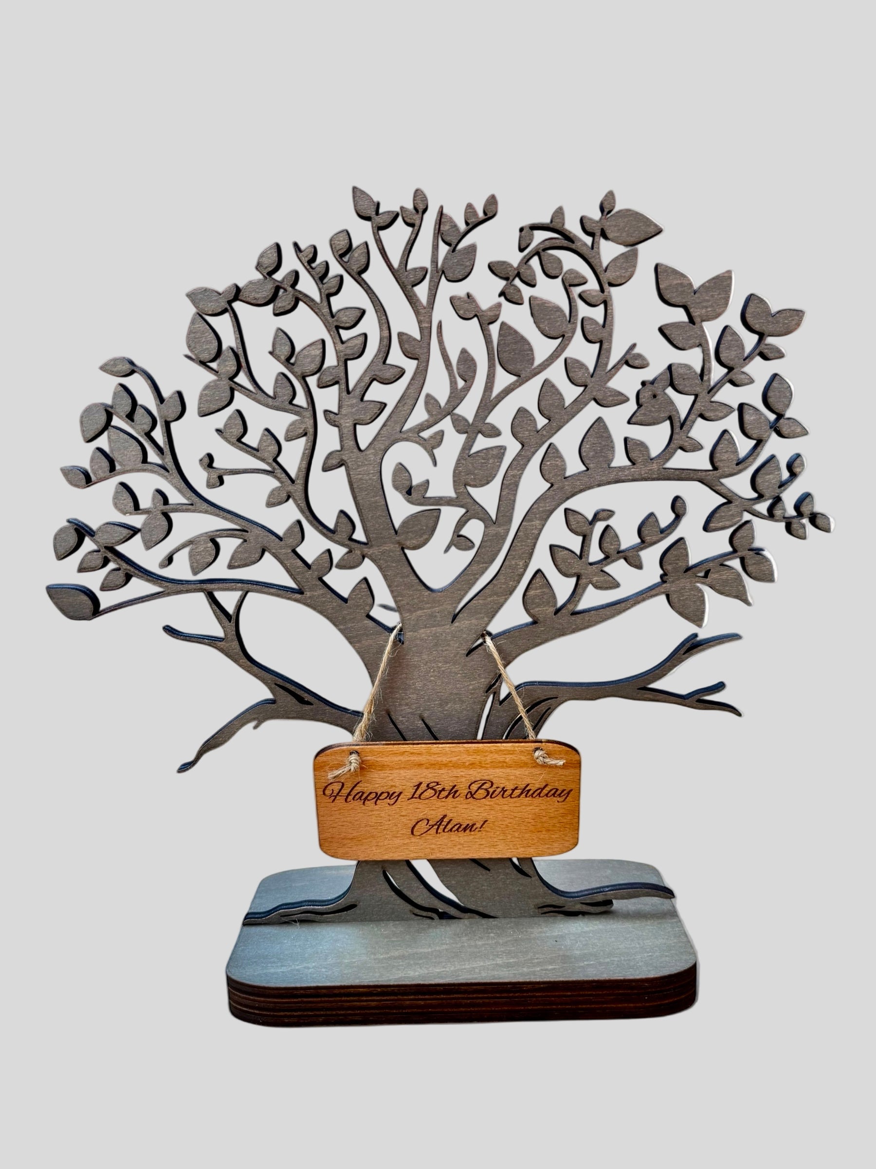 Crafted with care from wood and stained in a beautiful driftwood brown, this elegant tree stands 30 cm tall and 29 cm wide, making it the perfect statement piece for any table or shelf. Its smooth finish gives it a refined, premium feel, while the customisable wooden sign lets you add a personal touch – name, date, or heartfelt message.